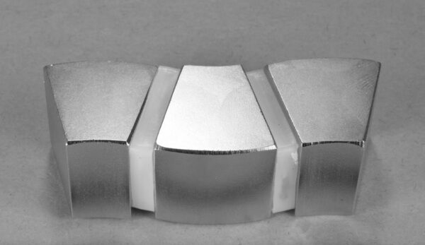 Introducing the AY0X030-C, a versatile arc segment magnet that is a cornerstone in constructing intricate magnetic assemblies. This segment is meticulously designed to integrate with 11 other units to create a magnetic ring with a 4″ outer diameter and a 2″ inner diameter. Each segment is magnetized across a 30º sweep, facilitating a side-to-side attraction that aids in forming a cohesive and stable ring.