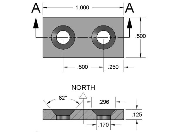 This popular block magnet measures 1″ x 1/2″ with a thickness of 1/8″, and it features holes for two #6 flathead screws, providing easy fastening. What sets the BX082CS-N-N52 apart is its high-grade N52 magnet material, offering even more magnetic strength. This magnet is magnetized such that the north pole is on the countersunk side.