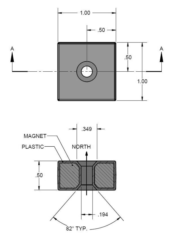 Dimensions | 1″ x 1″ x 1/2″ thick w/ hole to accept #8 screws |
