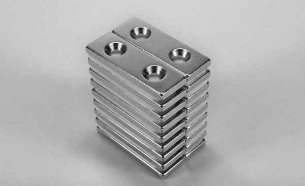 These countersunk block magnets serve a broad range of applications, notably door closures and tool hangers. The same size without the countersunk holes is accessible in grade N42 as BX882 and in grade N52 as BX882-N52.