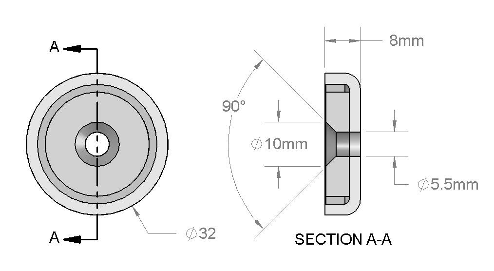Dimensions D=32mm (1.26″) d1=5.5mm (0.22″) (Sized for M5 screw) d2=10mm (0.39″) (Tapered countersunk hole) h=8mm (0.32″)