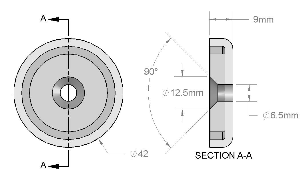 | Dimensions | D=42mm (1.65″) d1=6.5mm (0.26″) (Sized for M6 screw) d2=12.5mm (0.49″) (Tapered countersunk hole) h=9mm (0.35″) |
