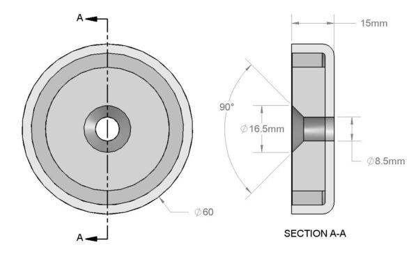 Dimensions | D=60mm (2.36″) d1=8.5mm (0.33″) (Sized for M8 screw) d2=16.5mm (0.65″) (Tapered countersunk hole) h=15mm (0.59″) |