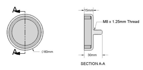 Dimensions | D=60mm (2.36″) M=8mm (0.32″) (M8 Coarse Male threaded stud) H=30mm (1.18″) h=15mm (0.59″) |