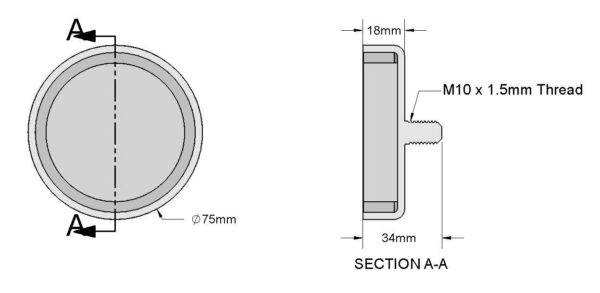 Dimensions | D=75mm (2.95″) M=10mm (0.39″) (M10 Coarse Male threaded stud) H=34mm (1.34″) h=18mm (0.71″) |