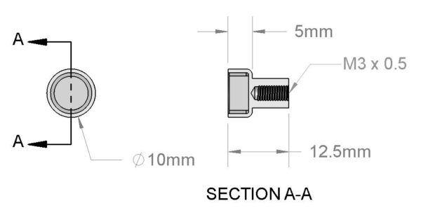 Dimensions | D=10mm (0.39″) d=3mm (0.12″) (M3 Coarse Female threaded stud) H=12.5mm (0.49″) h=5mm (0.20″) M=6mm (0.24″) |