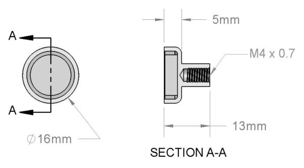 Dimensions | D=16mm (0.63″) d=4mm (0.16″) (M4 Coarse Female threaded stud) H=13mm (0.51″) h=5mm (0.20″) M=6mm (0.24″) |