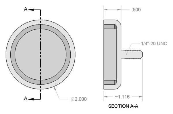 Dimensions | Diameter = 2″ (2.00″) Threaded Male Stud = 1/4″-20 UNC 2A Height = 1/2″ (0.50″) |