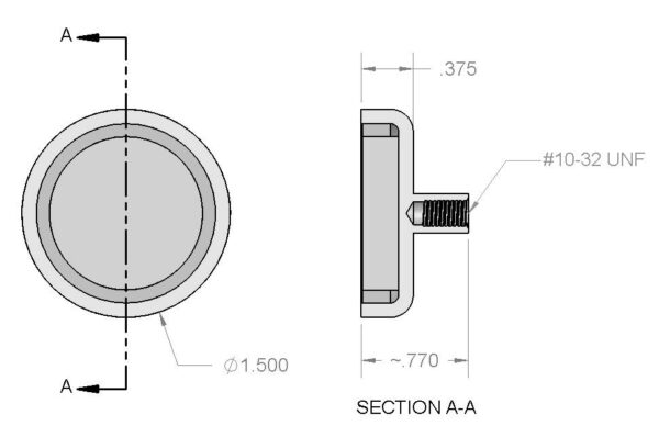 Dimensions Diameter = 1 1/2″ (1.50″) Threaded Female Stud = #10-32 UNF 2B Height = 3/8″ (0.375″)