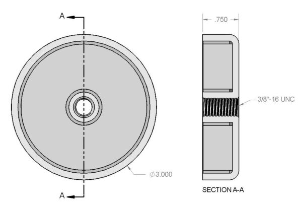 Dimensions Diameter = 3″ (3.00″) Internal Thread Size = 3/8″-16 UNC 2B Height = 3/4″ (0.75″)