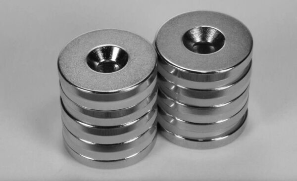 Featuring a 7/8″ diameter and a 1/8″ thickness, the RE22CS-P countersunk ring magnets are tailored to accommodate a #8 countersunk screw. Offered as a complementary pair, one ring showcases the north pole on the countersink side, while its counterpart features the south pole in the same position, ensuring a magnetic attraction upon installation.