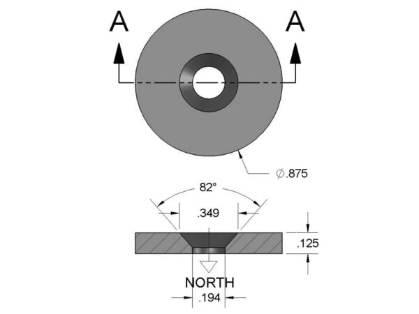 Boasting a 7/8″ diameter and a 1/8″ thickness, the RE22CS-S-N52 countersunk ring magnets are precision-crafted to fit a #8 countersunk screw. Distinctly, the south pole is positioned on the countersink side.