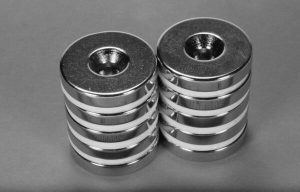 Experience the strength of the RX033CS-P-N52 countersunk ring magnets, precision-crafted to fit a #10 countersunk screw. Offered as a pair under the part number RX033CS-P-N52, one ring features the north pole on the countersink side, while its counterpart boasts the south pole in the same position, ensuring they magnetically attract when installed.